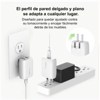 Con unas medidas de 55 x 42 mm de ancho y una profundidad de solo 23 mm, este cargador compacto se coloca plano en la pared para que quepa fácilmente detrás de los muebles o en tomas de corriente difíciles de alcanzar. También tiene el tamaño perfecto para caber en un bolsillo o bolso, lo que significa que tendrá acceso a una carga rápida dondequiera que vaya.